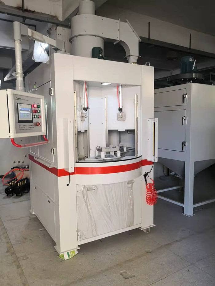 本设备是根据我公司针对各类产品和处理要求而专门设计的转盘式自动喷砂机,完全适合贵公司所提供的产品。根据贵公司对产品效率的要求,本机共大转盘共设置4个区域(90度一个区域),每个区域设置3个工件装夹工位。大转盘每转动90度区域一停,喷砂区域内共布置9支普压高速喷砂枪,在喷砂区1个区域 3个喷砂加工位,各布置3支喷砂枪对工件需喷砂部位做自动喷砂加工,喷枪可根据加工需要,随意调整其喷射角度,其自动化程度较高。